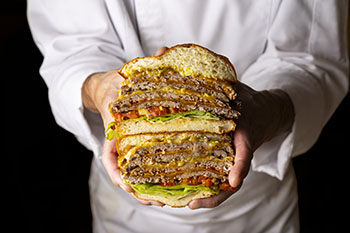 濃厚な牛チャックロールの旨味に和牛の脂の風味を加え、粗挽きと中挽きを独自配合。つなぎゼロでジューシー、食感もしっかり楽しめる食べ応え抜群の4枚重ねパティです。
